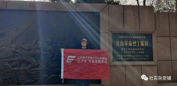“新时代青年”实践团怀着无比崇敬的心情走进陵园。映入眼帘的是镌刻着“人民英雄永垂不朽”八个鎏金大字的人民英雄纪念碑。右侧墙上赫然刻着“缅怀革命先烈,传承红色经典”十二个大字,英雄广场的烈士雕像魏然矗立,烈士纪念墙上是革命烈士的名字,济阳惨案纪念碑上记录着一段骇人听闻的历史故事……围绕习近平总书记系列重要讲话精神“新时代青年”实践团开展了对烈士陵园社情近况的观察并记录。