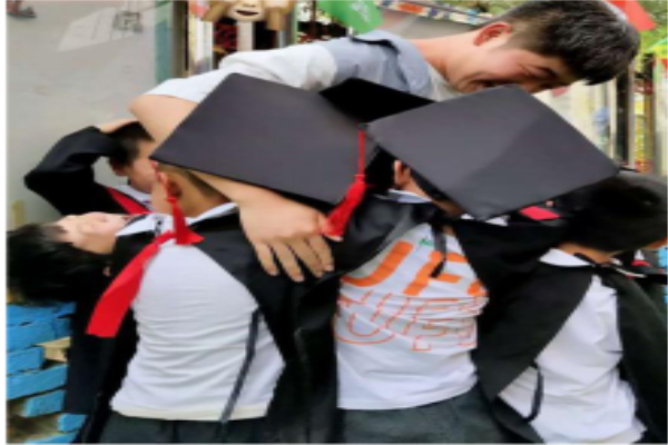 毕业典礼结束后孩子们正在开心的拥抱为他们表演节目的老师